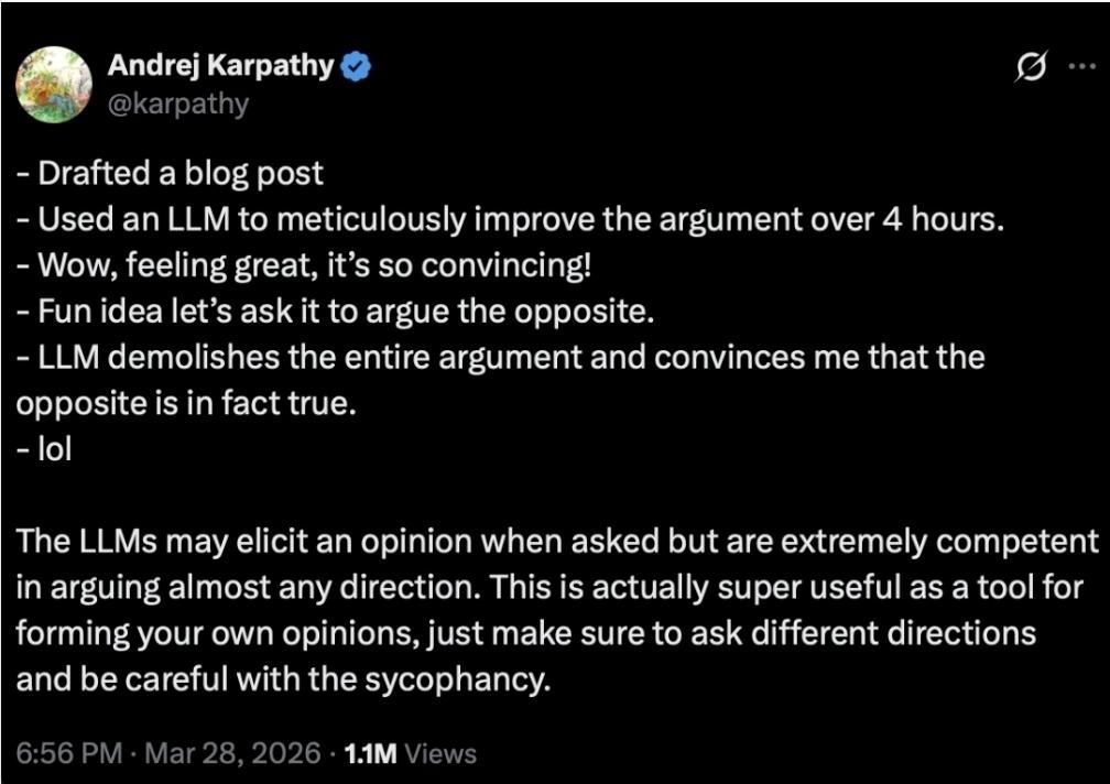 Ironically, it’s not so much the LLM that’s to blame here, but our own innate tendency to -not- do dialectic thinking, and simply stick to our convictions and opinions instead. Yet another reason to move our focus away from technology to humanity, and start practising critical thinking skills, rhetoric and philosophy.